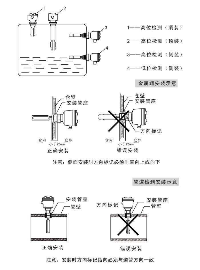音叉式物位開關(guān)通常采用側(cè)裝(在倉壁側(cè)面安裝)方式安裝與倉體側(cè)壁對(duì)料位高度進(jìn)行上下限位置的檢測;當(dāng)倉體不便側(cè)面開孔時(shí)可采用頂裝(在倉的頂部安裝)方式安裝,位置應(yīng)選擇能避開進(jìn)料