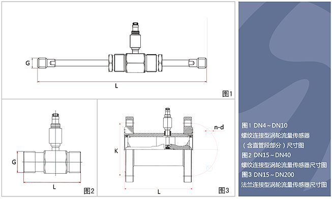 傳感器的安裝方式根據規格不同,采用螺紋或法蘭連接,安裝方式見圖1、圖2、圖3,安裝尺寸見下表: